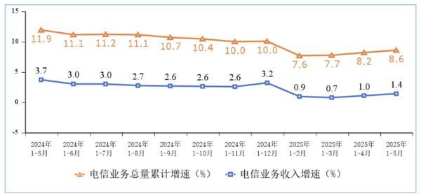 电信业务量收增速逐步提升。前5个月,电信业务收入累计完成7488亿元,同比增长1.4%。按照上年不变价计算的电信业务总量同比增长8.6%。