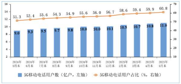 5G用户占比超六成。截至5月末,三家基础电信企业及中国广电的移动电话用户总数达18.07亿户,比上年末净增1699万户。其中,5G移动电话用户达10.98亿户,比上年末净增8414万户,占移动电话用户的60.8%。