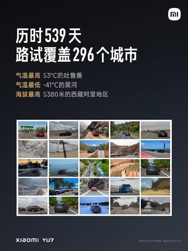 雷军强调,YU7作为小米摩德纳平台的第二款力作,公司对品质的追求从未妥协。据他介绍,为了全面验证车辆性能,小米投入了653台测试车辆进行整车验证。这些车辆在发布会前已累计完成了649万公里的道路实测,测试历程长达539天,足迹遍布全国296个城市。这一系列的测试不仅涵盖了各种复杂路况,还特别针对恶劣天气条件下的通过性进行了充分验证。